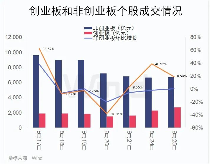 Wind数据显示,以上一周注册制未开始时成交来看,8月17日和19日,上周一、周三创业板成交较前一个交易日放大低于非创业板,而上周二和周四则是创业板成交较非创业板成交稍活跃些,整体平稳。但从上周五开始,创业板成交开始快速放大。在非创业板个股合计成交下降5.59%下,创业板单日成交额为1624.21亿,较前一个交易日大幅增长8.56%,资金流向创业板明显。