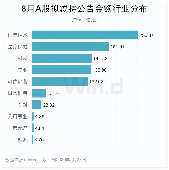 按照Wind一级行业划分,信息技术、医疗保健、材料、工业和可选消费5个行业拟减持金额居前,均超过百亿,具体分别为250.37亿元、181.91亿元、141.58亿元、139.8亿元和132.02亿元,五大行业合计拟减持金额达845.68亿元,占比92%。