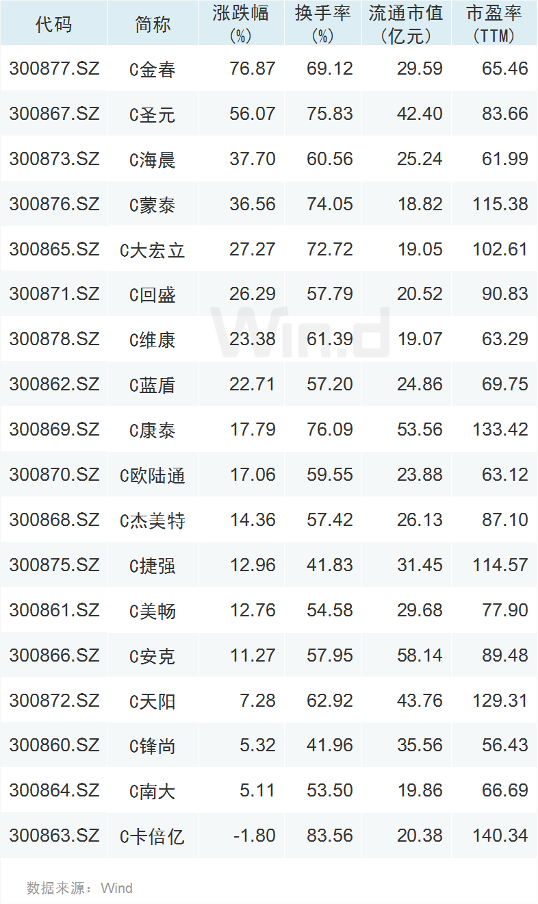 截至8月25日收盘,24日上市的18家上市的创业板公司再度集体大涨,除4家公司涨幅小于10%外(包括1家下跌),其余公司涨幅均超过10%,其中C金春涨幅达76.87%,位居首位;C圣元涨幅56.07%紧随其后。此外,C海晨、C蒙泰、C大宏立、C回盛、C维康、C蓝盾涨幅超过20%。