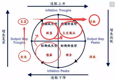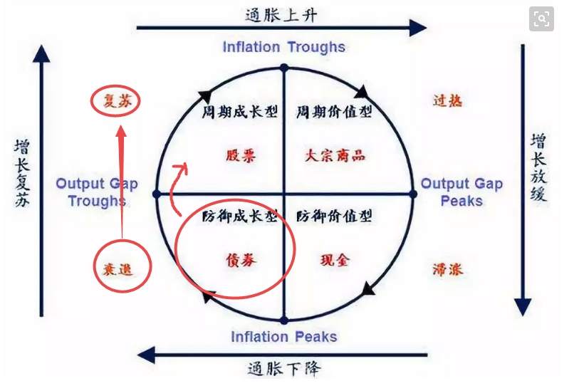 这一点我们在《经济开始复苏》里贴过的美林时钟上,可以清楚的看到: