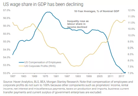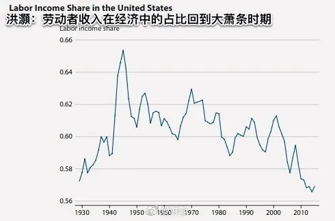 前两天收到一张交银国际洪灏做的图,反映的是劳动者收入在经济的占比。
