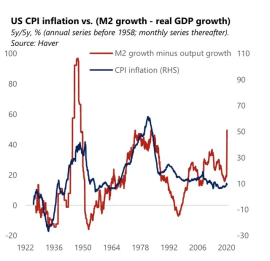 天量刺激导致美国的M2货币增速创下了二战以来的新高,这远超美国GDP的增长速度。