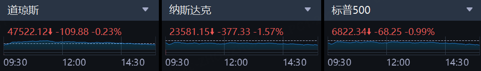 周四,美股三大指数集体下跌。截至收盘,道琼斯指数跌0.23%,报47522.12点;标普500指数跌0.99%,报6822.34点;纳斯达克综合指数跌1.57%,报23581.14点,终结了连创新高的势头。