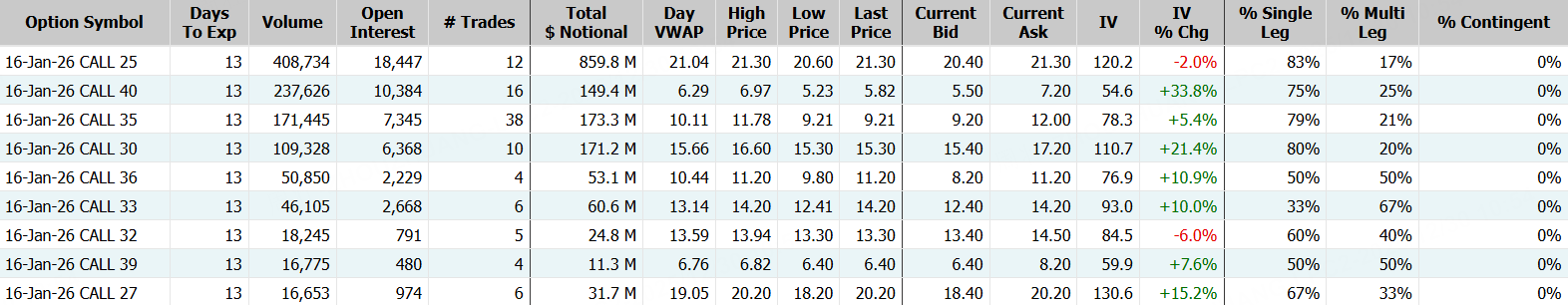 Global X Uranium ETF成交119.12万张,较90日均量放大逾61倍,看涨期权占比99.7%,其中于2026年1月16日到期25美元行使价的看涨期权成交居前,成交逾40万张;