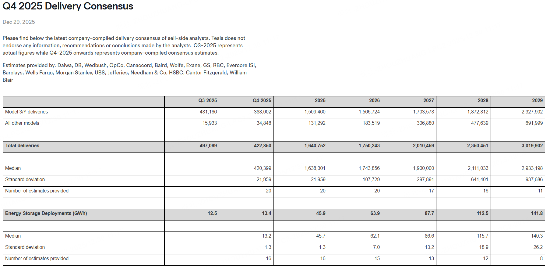 多年来,特斯拉一直会汇总卖方分析师的预测数据,但这类信息通常仅由投资者关系团队通过邮件,私下分享给指定的分析师及主要投资者。然而在今日,该公司决定将这份数据公之于众:特斯拉称这份共识预期为“企业自主汇总”,其中显示 2025 年第四季度交付量的市场中位预期值为 420,399 辆,均值预期则为 422,850 辆。