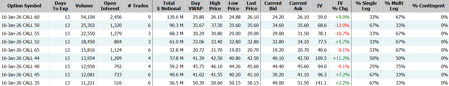 Silver Miners ETF成交25.9万张,较90日均量放大逾51倍,看涨期权占比98.8%,其中于2026年1月16日到期60美元行使价的看涨期权成交居前,成交逾5.4万张。