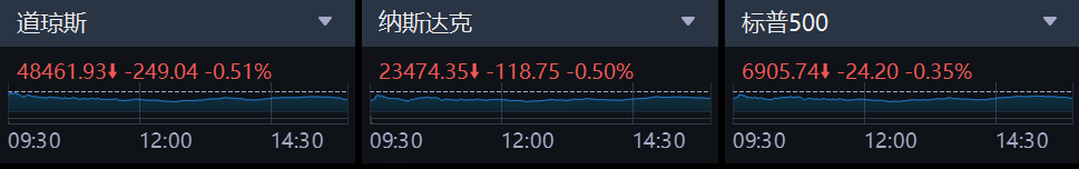 周一,美股三大指数集体收跌。截至收盘,标普500指数跌0.35%,报6905.74点;纳斯达克综合指数跌0.5%,报23474.35点;道琼斯工业平均指数跌0.51%,报48461.93点。