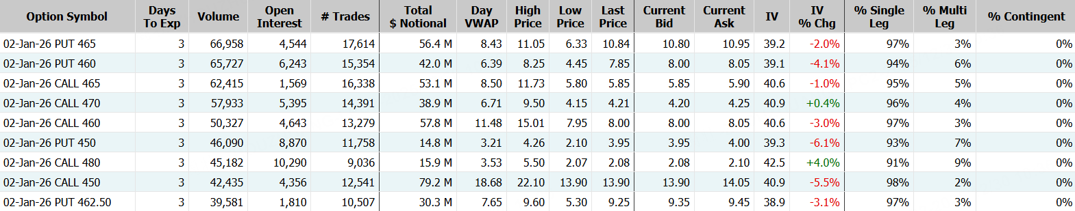 特斯拉隔夜股价大跌逾3%,领跌科技七巨头;期权方面,特斯拉成交176.1万张,看跌期权占比攀升至43.6%,其中于2026年1月2日到期的465美元行使价的看跌期权成交居前,成交近6.7万张。