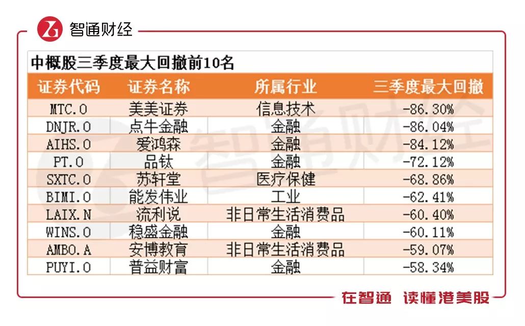相比之下,爱鸿森(AIHS.US)、点牛金融(DNJR.US)、美美证券(MTC.US)成为三季度市值下跌幅度最大的标的,智通财经APP了解到,三家公司均为金融相关公司,三者下跌幅度均超80%。整体来看,三季度市值跌幅前10名的公司中,以金融、教育相关企业居多。除此之外,在280只中概股中,共有8只标的于三季度单个季度中出现了60%以上的回撤。其中,美美证券(MTC.US)、点牛金融(DNJR.US)、爱鸿森(AIHS.US)、品钛(PT.US)、稳盛金融(WINS.US)无一不是金融类企业,其中多家公司均为互金企业。