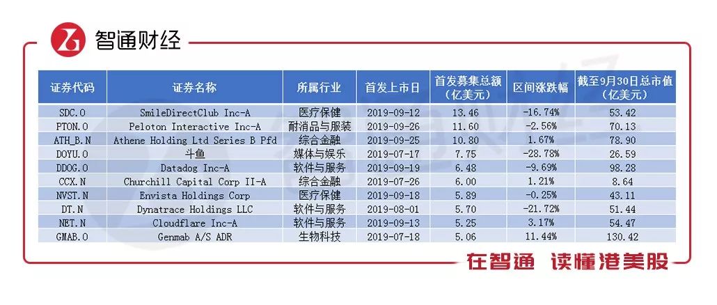 根据可统计数据,美国股市2019年第三季度IPO达85起,数量较去年同期及上一季度均有所下滑。截至前三季度,美国股市IPO数量共达276起。相比之下,融资规模较去年同期则有所上升,达137.45亿美元。三季度中,募资规模最大的公司为一家医疗保健公司SmileDirectClub(SDC.US),IPO募资规模达13.46亿美元,然而公司于上市后经历了16.74%的下滑。在美股三季度募资规模前十的IPO中,软件与服务公司数量最多。