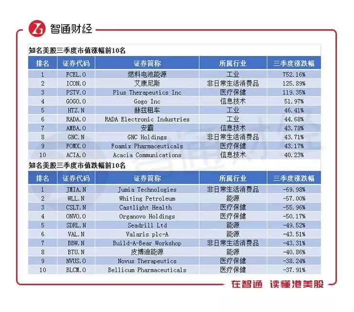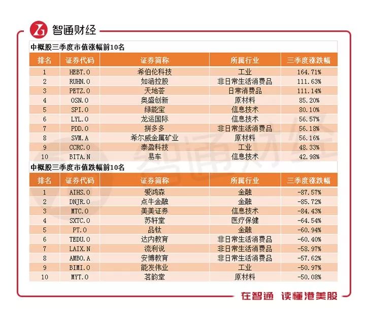 从市值表现来看,燃料电池能源(FCEL.US)为三季度市值上涨最快的公司。整体来看,信息技术、工业行业聚集了最多市值大幅上涨的公司。相比之下,三季度中市值下跌最多的公司多集中在医疗保健、能源行业。截至三季度,希伯伦科技(HEBT.US)、 如涵控股(RUHN.US)、天地荟(PETZ.US)为中概股中市值上涨最快的公司,涨幅均超过100%。在中概股市值涨幅前10名中,科技公司占比较大。