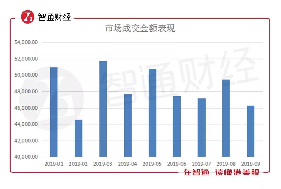 此外,下图中VIX指数取每月收盘价格进行连线,体现三个季度以来的大致走势,整体与美股保持负相关关系。整体而言,VIX指数较美股表现敏感度更高,波动幅度更大。成交额方面,成交金额环比下滑的月份较多,2月、4月、6月、9月均出现下滑(NYSE、NASDAQ、AMEX三个市场合计)。其中,成交额于2月出现大幅下滑后,于3月份有所恢复。2019年三季度,三个市场整体成交额达14.29万亿美元,较去年同期下滑2.13%。