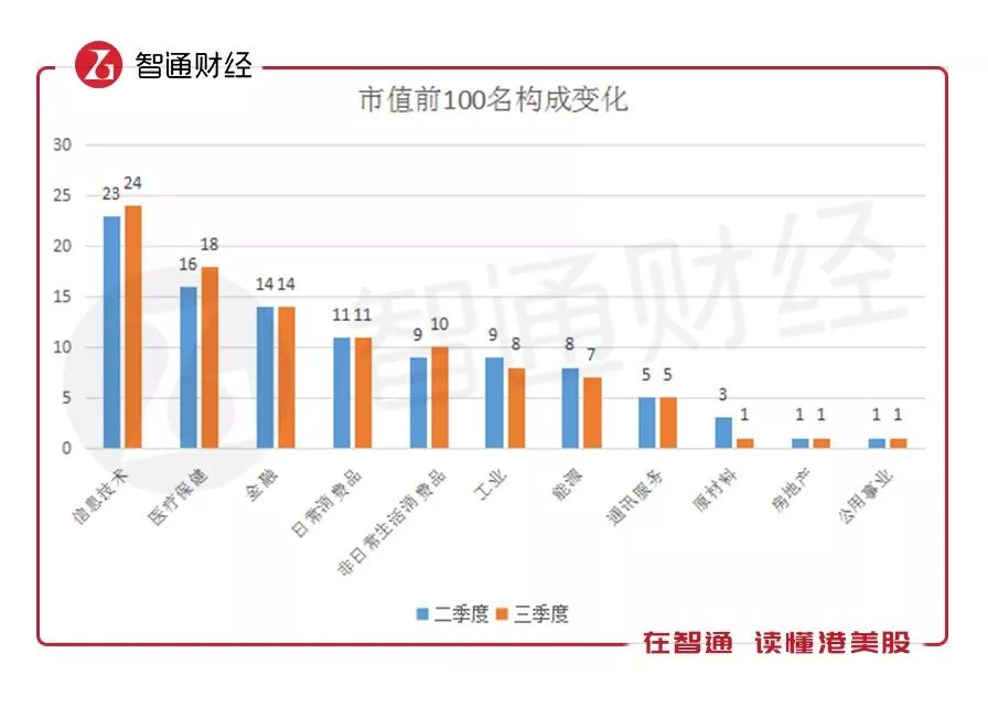 可以看出,美股三季度增长乏力或主要是受医疗行业增长动力不足所拖累。若纵观前三季度整体表现,医疗保健或将成为2019年影响美股增速的最主要行业。然而,若从三季度美股市值前100名行业分布来看,医疗保健行业依然累积了较多大市值公司,并且数量于三季度进一步增加2家。总体来看,科技行业依旧是美股聚集大市值公司最多的行业。