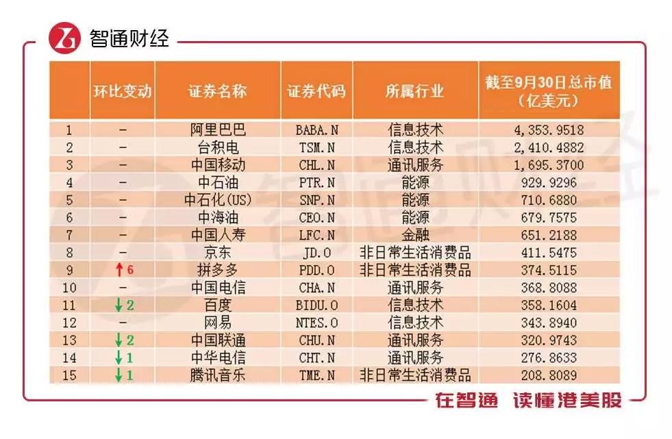 从上市后表现来看,三季度赴美上市的中概股中,多数在上市后股价出现了下滑。仅9F玖富(JFU.US)出现了较好的上涨表现。2、拼多多黑马出线,百度跌出前十