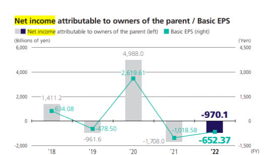 2021财年软银集团迎来了成立以来最大规模的年度亏损,该财年净亏损约1.7万亿日元,约合131.2亿美元。2022财年亏损还在延续,亏损额约为亏损72亿美元。