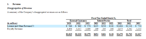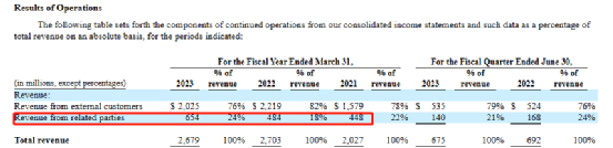 安谋科技是ARM重要的客户。在招股书中,安谋科技给ARM贡献的收入算关联方的收入。2021财年至2023财年,安谋科技给ARM带来的收入分别为4.48亿美元、4.84亿美元、6.54亿美元,营收占比分别为22%、18%、24%。