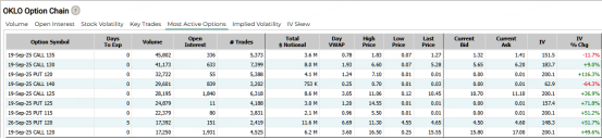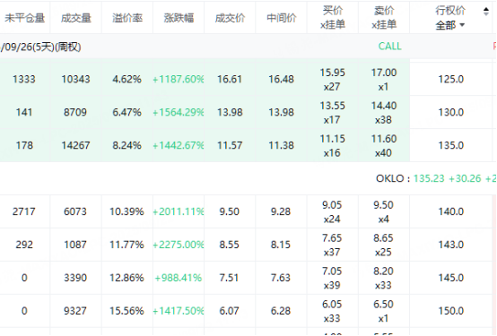 核电股Oklo股价飙涨28%,期权合约成交较90日平均暴涨5.6倍达684,229 张。其中9月19日到期的135美元看涨期权交易量较高,共有45,802份合约交易。