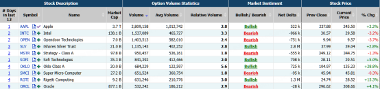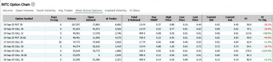 上周五,英特尔跌超3%,期权合约成交较90日平均上涨3.3倍达1,537,089 张。其中9月19日到期的30美元看跌期权交易量较高,共有107,357份合约交易。