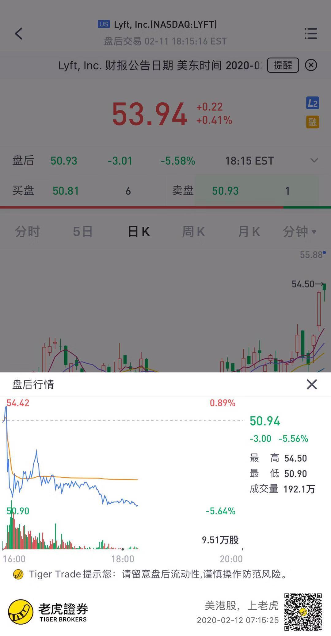 Lyft在周二常规交易时间上涨0.41%,收盘价为53.94美元;尽管该公司第四季度业绩均优于预期,但由于未能预计提前盈利,Lyft股价周二盘后下跌超过5%。目前该公司股价和优步一样,仍然低于IPO发行价72美元,但今年以来已经上涨25%。