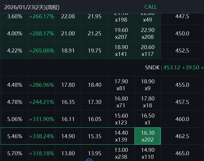 随着股价大涨,Sandisk认购合约的价格也同步拉升,本周合约批量涨超200%、300%,最高涨幅超338%。