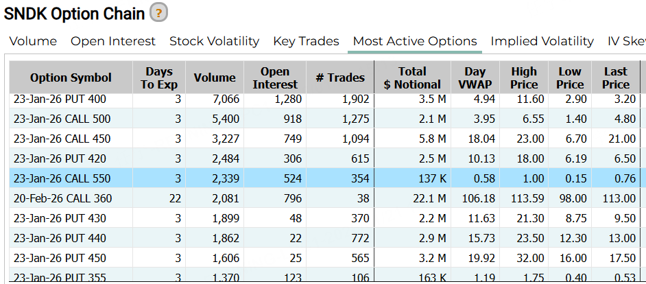 期权方面,Sandisk昨日前十大成交中,PUT占比较高。一张本周五到期的行权价550美元的CALL比较引人关注。