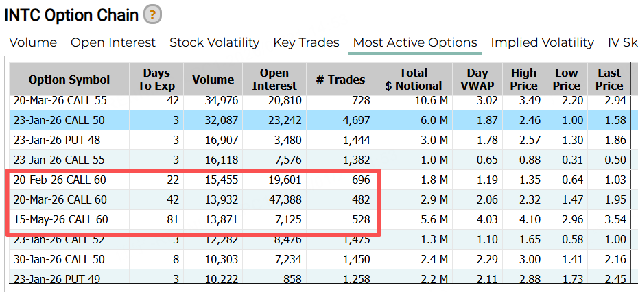 二、个股期权成交:英特尔,多张CALL押注60美元