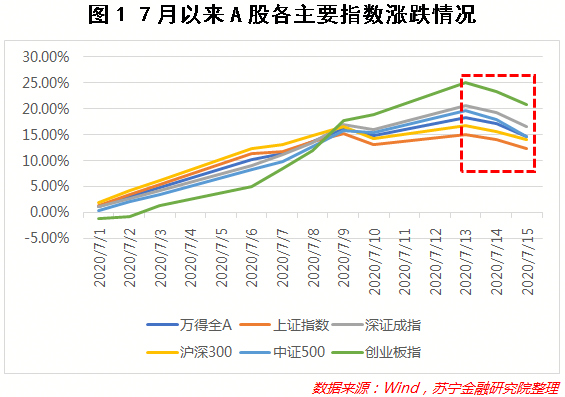 7月以来,A股各主要指数放量快速上涨后,近两个交易日有所调整(见图1),高涨的市场情绪开始摇摆:这是股市的正常调整(意味着上车),还是牛市结束的前奏(意味着下车)?