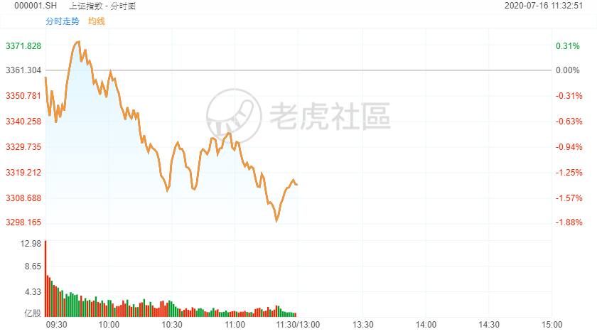 7月16日,指数延续调整,两市成交量有所下降,市场资金情绪相对谨慎。截至午间收盘,沪指跌1.41%,报收3314点;深成指跌1.73%,报收13541点;创业板指跌1.73%,报收2764点。