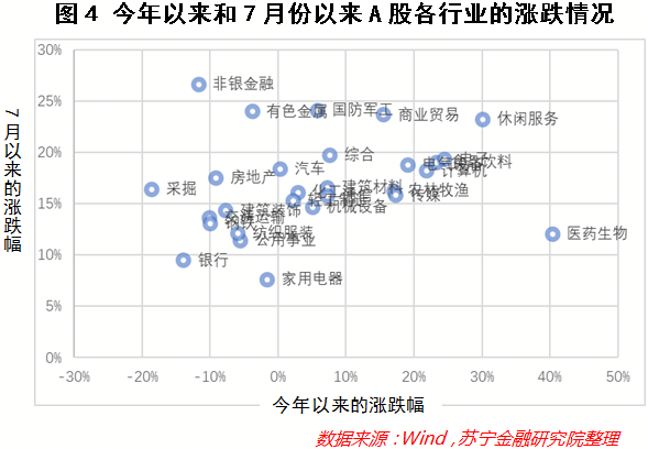 从图3可以看出,7月之前A股各主要指数的涨跌差异很大,表现最好的是创业板指,表现最差的是上证综指,7月以来表现较弱的指数有补涨,但综合今年以来的情况看,A股指数的分化还是比较明显,成长风格明显占优。