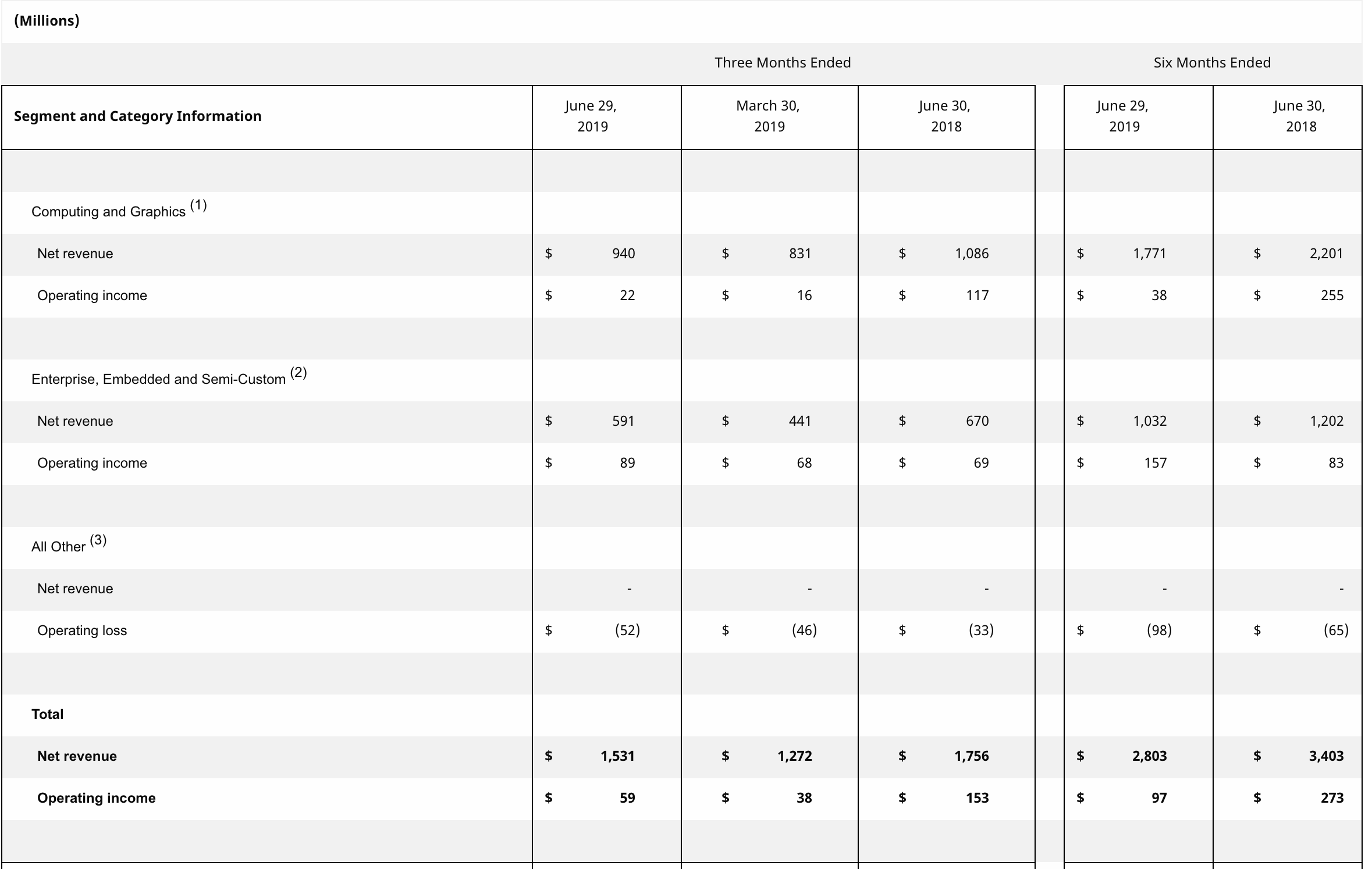 AMD总裁兼首席执行官苏姿丰博士(Dr. Lisa Su)在声明中表示,第二季度公司增加了三款旗舰型7纳米制程产品系列的产量,已经达到了重要转折点,新的锐龙、镭龙(Radeon)和霄龙处理器组成了公司历史上最有竞争力的新产品组合,并有能力在下半年实现显著增长。