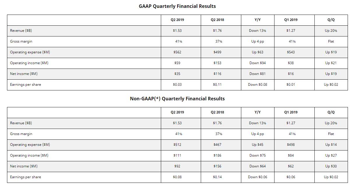 芯片制造商AMD$(AMD)$于7月30日周二美股盘后公布了2019财年二季度财报,营收略超市场预期,调整后每股收益符合预期,但公司给予的下季度展望不及预期,美股盘后跌3%。财报显示,第二季度营收15.3亿美元,较去年同期17.6亿美元下滑13%,略高于市场预期的15.2亿美元。