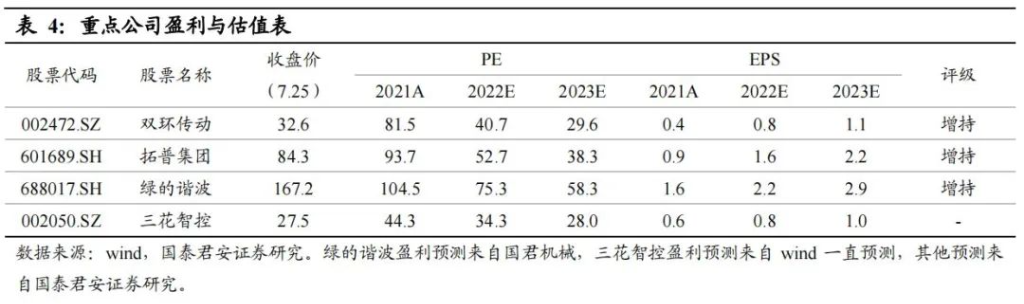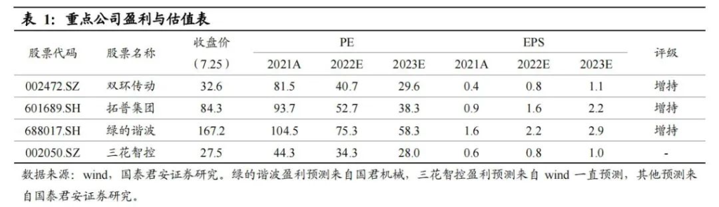 我们认为人形机器人中成本占比高、格局相对确定的关节及其相关部件将率先爆发,考虑新能源汽车与人形机器人在三电系统、传感系统、人机交互系统有相似或重合,特斯拉产业链上的核心供应商也有望受益,推荐标的双环传动、拓普集团、绿的谐波(国君机械覆盖),受益标的三花智控等。
