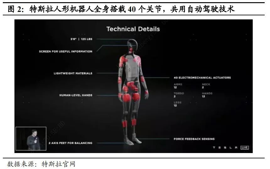 特斯拉人形机器人被命名为Optimus,最早将于2023年开始生产,用来填补劳动力缺口,执行危险、重复或太无聊而人们不愿意从事的工作。从公布的参数看,Optimus身高约172厘米、体重约56公斤、负载20千克,行走速度最高可达每小时5英里。身体由轻量材料覆盖,头部为扫描外界信息的屏幕,全身累计搭载了40个机电传动器。此外,该机器人采用特斯拉Dojo(道场)机器学习培训系统,芯片为自研AI训练芯片D1,和特斯拉共用自动驾驶软件系统(FSD)以及摄像头系统。