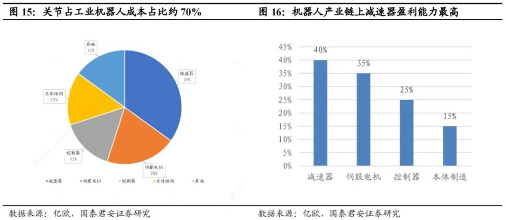 从成本结构来看,关节占到机器人的1/3到50%以上成本。以工业机器人为例,减速器、伺服电机、控制器成本占比分别为35%、20%、15%,整体成本占比70%左右。从盈利能力来看,关节的相关部件的盈利能力也较高,尤其是减速器,主要是减速器产品壁垒高,全球竞争格局集中度高(现有龙头市场份额超过70%)。