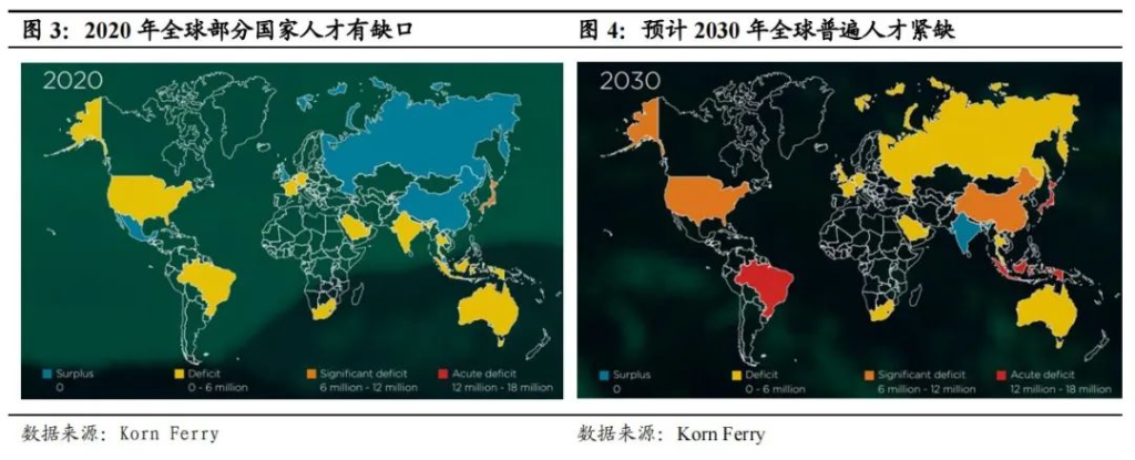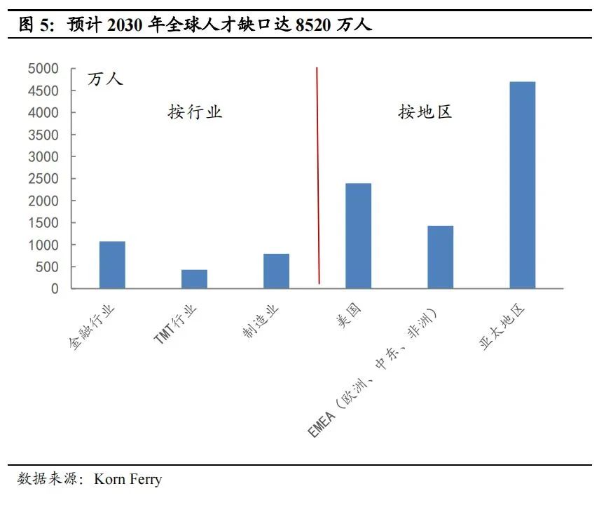 全球劳动力短缺日益严峻,预计2030年全球技术工人缺口超过8520万人。根据全球高级管理人才顾问公司Korn Ferry对全球人才展开的调查进行建模的指出2030年全球人才缺口将达到8520万,A级工人(指已完成大专或大学等高等教育,或具有高级贸易学院资格)的短缺相当于其所考察的20个国家中高技能劳动力的21%,如果不加以控制,人才短缺造成的损失预计达8.5万亿美元,相当于德国和日本一年的GDP总和。除了印度以外,2030年美国、德国、英国、中国、日本都面临不同程度的人才短缺;金融业、TMT行业、制造业预计2030年人才缺口分别达到1070万、430万、790万人。