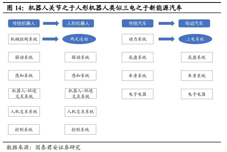 我们认为人形机器人中成本占比高、格局相对确定的关节及其相关部件将率先爆发,考虑新能源汽车与人形机器人在三电系统、传感系统、人机交互系统有相似或重合,特斯拉产业链上的核心供应商也有望受益。