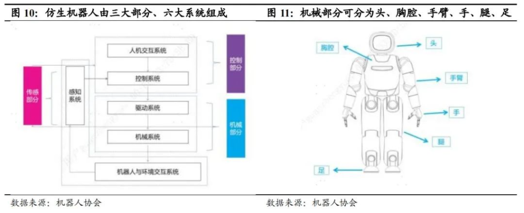 仿生机器人由三大部分(传感、控制、机械)和六大系统(感知、人机交互、控制、驱动、机械、机器人与环境交互)组成,其中机械部分是其他几个部分的基础,机械部分有驱动系统和机械系统;按部位分类,机械部分又可以分为头、胸腔、手臂、手、腿和足等。