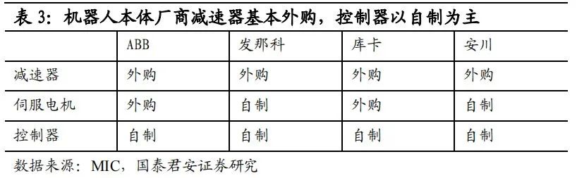 关节主要由减速器、电机、控制器等部件组成,其中机器人厂商的减速器外购为主,控制器自制为主。