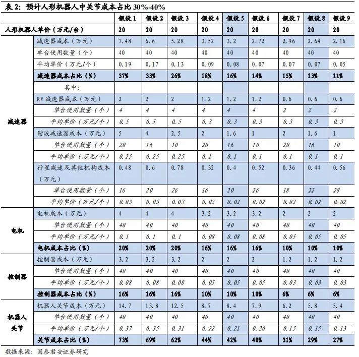 假设人形机器人平均价格20万元,规模效应下每个RV、谐波减速器价格下降至3000元和1000元左右,每个电机和控制器价格下降至500-800元和300-500元,那么对应的每台人形机器人关节成本占比约29%-42%,其中减速器成本占比13%-16%,电机成本占比10%-16%,控制器成本占比6%-10%。