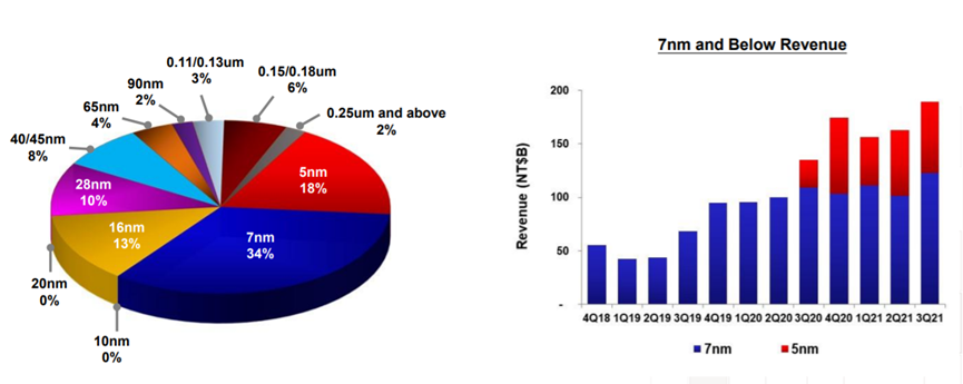 其中7nm及5nm受到智能手机及高效能运算需求驱动,两者营收合计已超越台积电整体过半比重,且处于持续增长中。5纳米是台积电营收的重要来源。根据台积电第三季度业绩表现,5纳米制程出货占该公司2021年第三季晶圆销售金额的18%,,与上一季度持平;7纳米制程出货占全季晶圆销售金额的34%,上一季度为31%。先进制程(7纳米及以上)的营收占比达到第三季度晶圆总营收的52%。