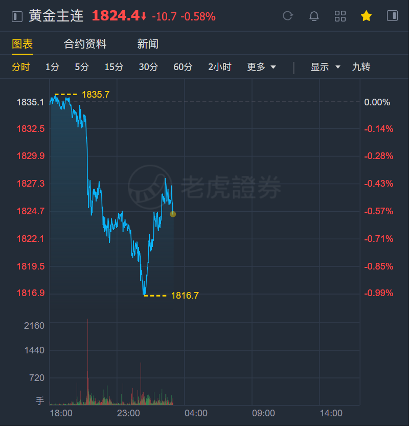 国际黄金小幅走低,日内跌0.58%,报1824.4美元/盎司。