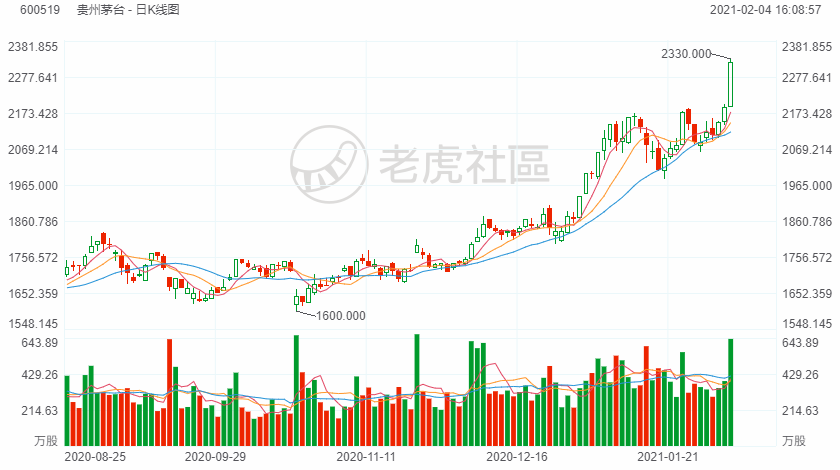 贵州茅台股价首次突破2300元/股,收于2320.85元/股,大涨5.98%,续创历史新高。至此,贵州茅台股价2021年已上涨逾16%,远远跑赢三大指数。