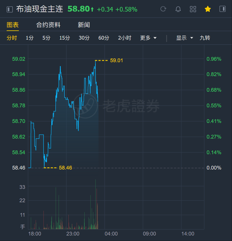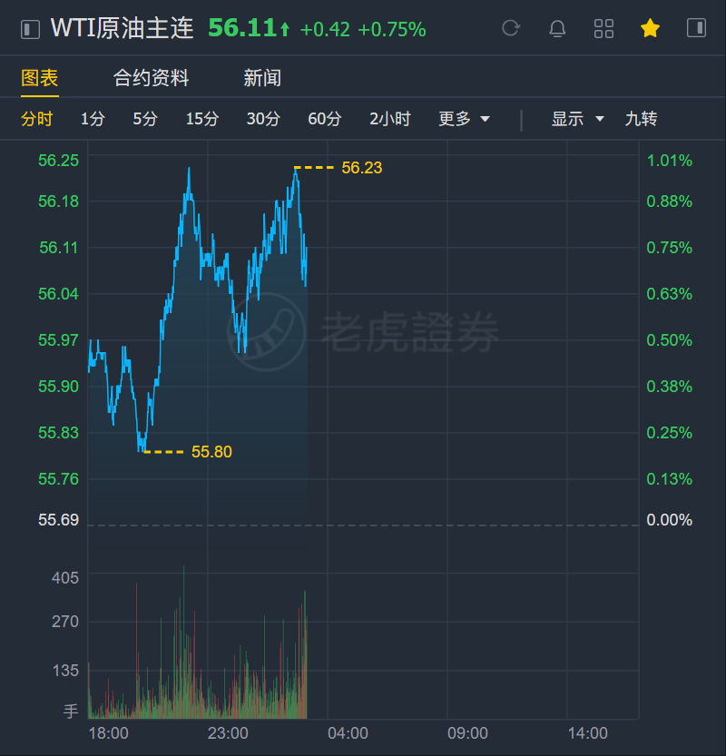 国际油价震荡拉升,截止发稿,美油报56.11美元/桶,涨0.75%;布油现报58.80美元/桶,涨0.58%。