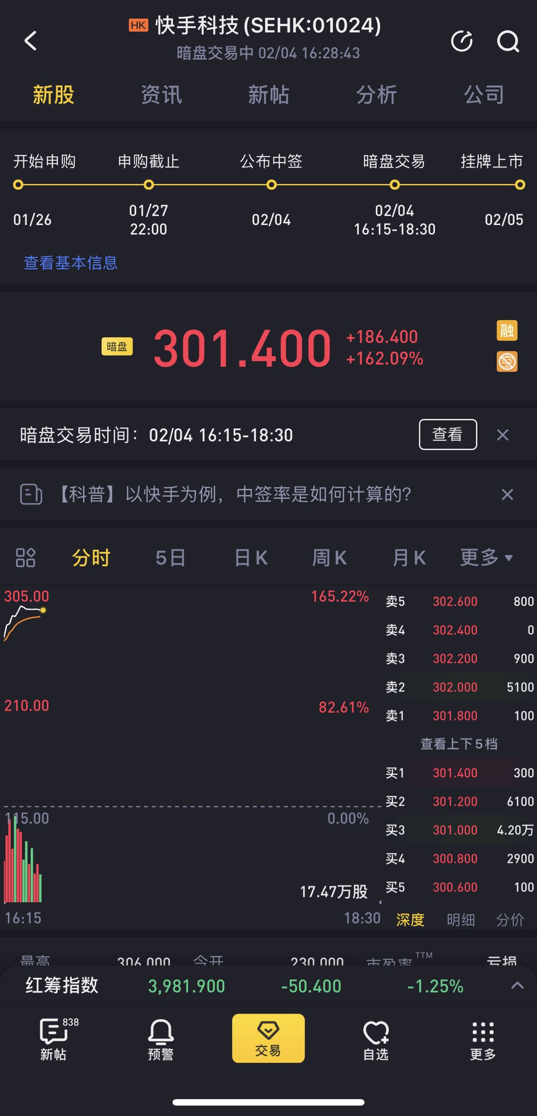 快手科技将于明天正式于港交所挂牌上市,截止发稿,今日暗盘涨超160%,报301.4港元,发行价115港元/股。