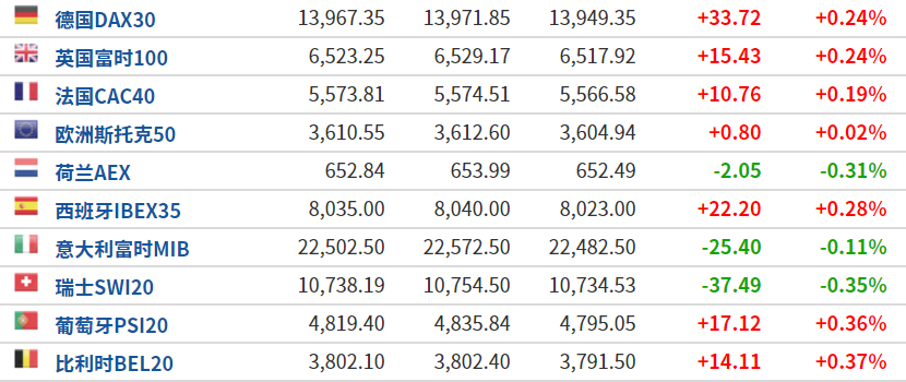 欧洲主要指数多数走高,截止发稿,德国DAX指数涨0.24%,英国富时100指数涨0.24%,法国CAC40指数涨0.19%,欧洲斯托克50指数涨0.02%。