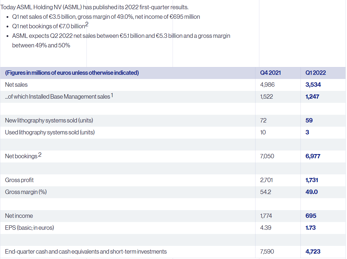 2022年Q1净利润6.95亿欧元,市场预期7.49亿欧元,去年同期13.31亿欧元。阿斯麦报告称,第一季度净利润环比下降约60%,销售额环比下降29%。
