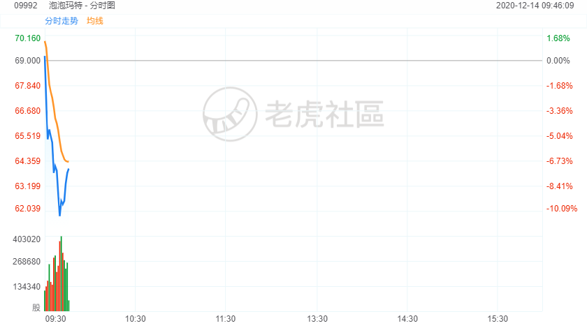 12月14日讯,“盲盒第一股”泡泡玛特$(09992)$跌幅扩大至超10%,目前已较上市首日最高价回落逾20%。