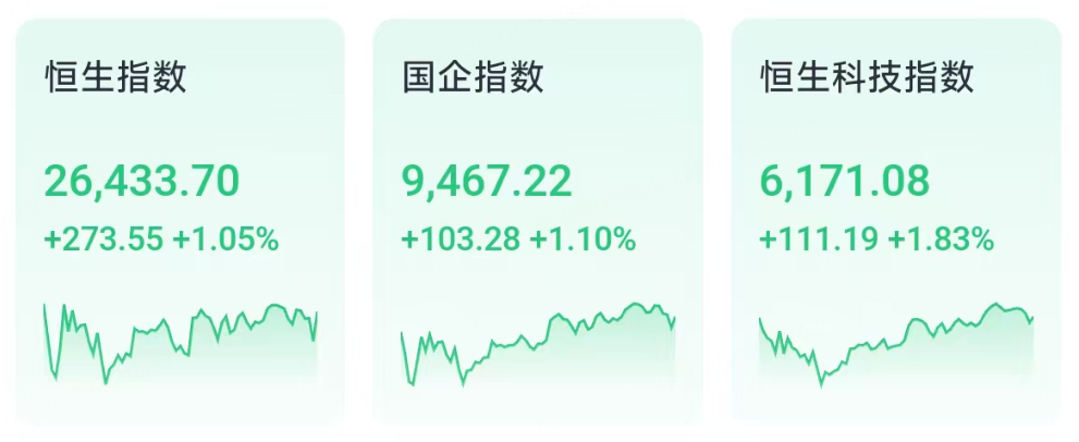 10月27日周一,中美贸易进展提振市场情绪,港股三大指数全天震荡走高。截至收盘,恒生指数涨1.05%,报26433.7点;恒生国企指数涨1.1%,报9467.22点;恒生科技指数涨1.83%,报6171.08点。