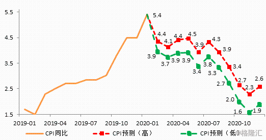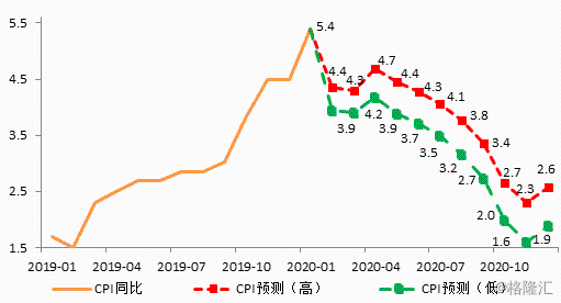 根据我们原先的测算,预计2020年CPI同比走势为高开低走,开年突破5%后开始趋势性回落,但上半年可能都在4%以上;3季度后加速回落,至4季度回归3%之下,全年中枢3.4%-3.9%。