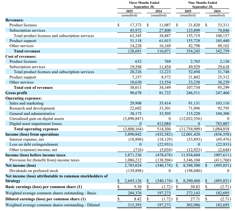 该公司表示,预计将通过优先股发行、以市场净资产值 (mNAV) 为指导的有纪律的普通股发行以及持续扩大比特币持有量来实现这些目标,从而强化其以数字资产积累为中心的长期战略。于10月30日股市收盘后发布了第三季度财报 ,净利润飙升至28亿美元。其稀释后每股收益(EPS)为8.42美元,超过分析师预期的8.15美元。